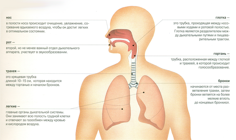 Система органов дыхания состоит из носовых ходов, гортани, трахеи, бронхов, легких и плевры (соединительнотканной оболочки, покрывающей легкие).Она обеспечивает поступление в организм кислорода, его попадание в кровь и выделение из организма углекислого газа.
